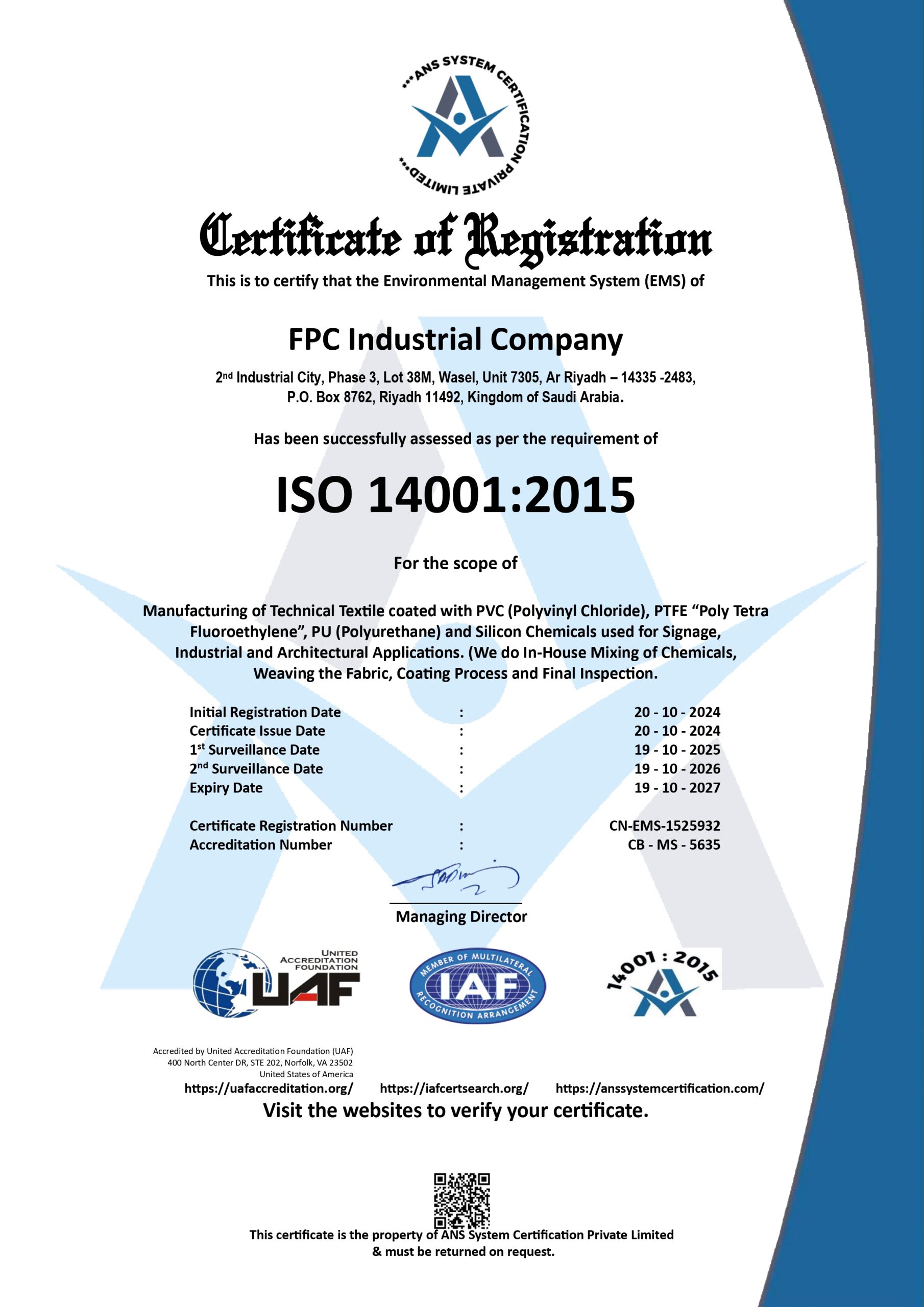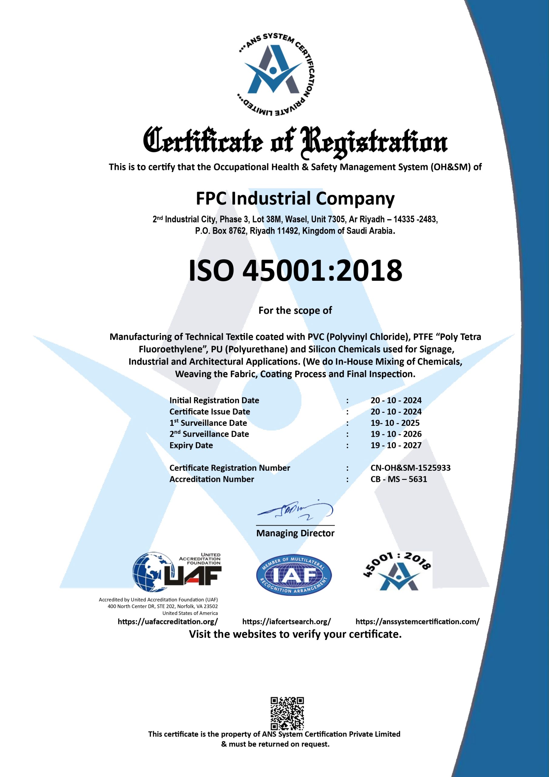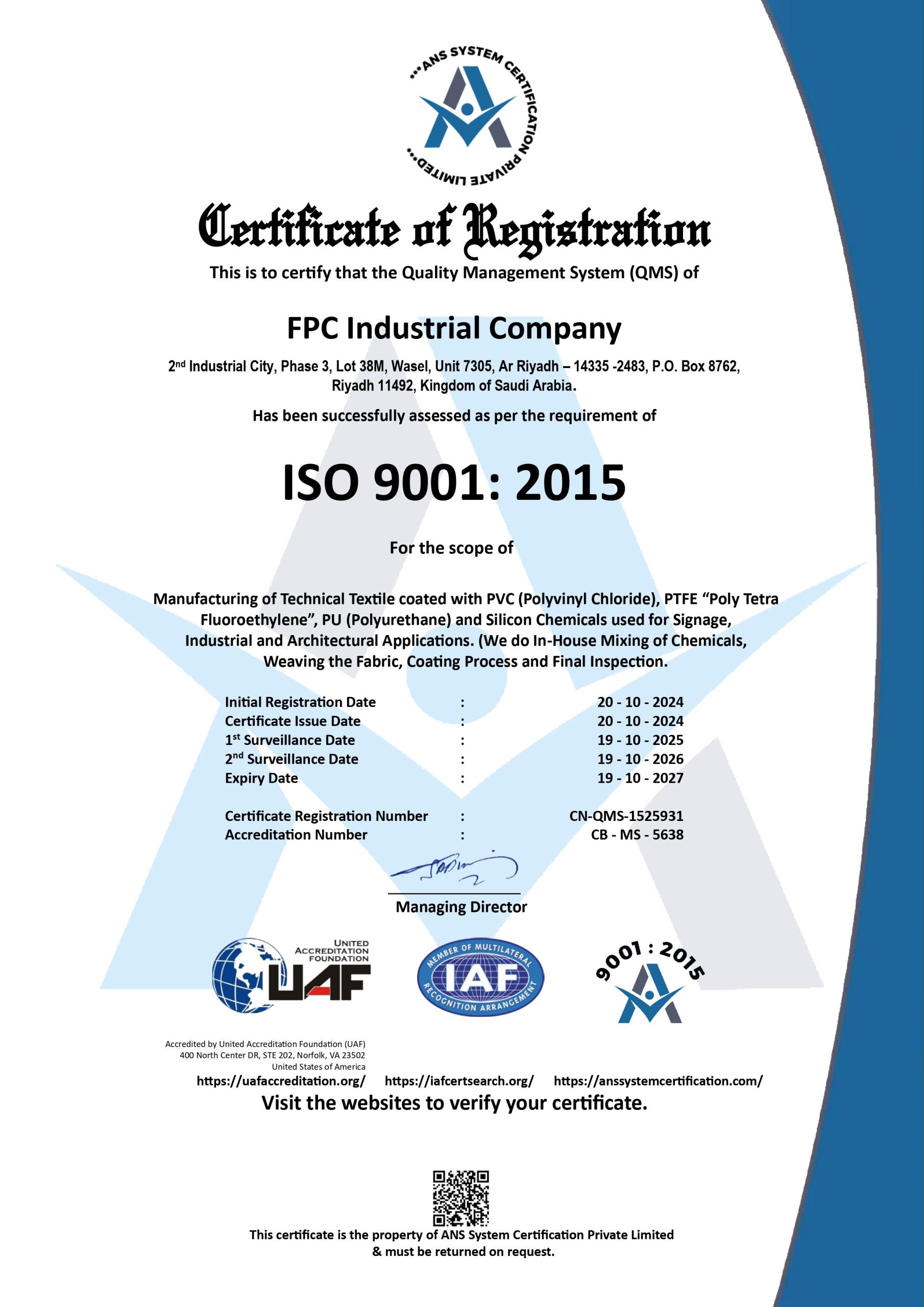 We are ISO and SASO certified and all our products conform to European REACH legislation. We aim high quality products to offer in the global market to keep us one of the top quality producers of PVC and PTFE coated technical textiles.